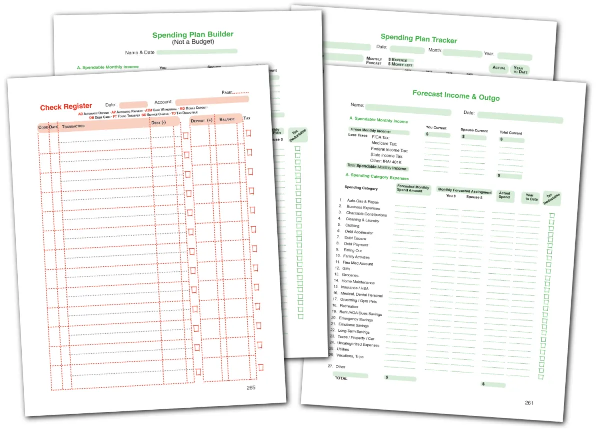 A complete pen-and-paper system designed to make you think carefully about your money. Includes a Spending Planner, Spending Tracker, Net Worth worksheet, Goal Setting worksheet, Debt Elimination report, Estate Planning checklist, Document Organization Framework, business entity reference guide, and an alphabetized list of 400+ IRS-allowed tax deductions.